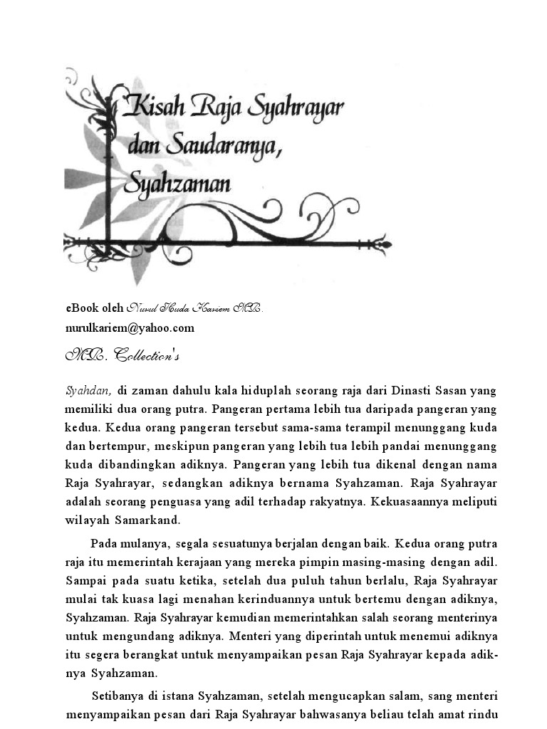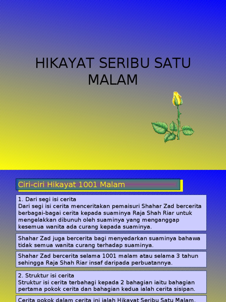 Buku Hikayat 1001 Malam / Hikayat raja banjar, tutur candi, dan hikayat hang.. Hikayat 1001 malam tak pernah berhenti dituturkan dari masa ke masa. Menganggap bahawa semua wanita jugacurang, baginda memerintahkan wazirnya untuk mendapatkan isteri yang baru setiap malam (dalam beberapa versi, setiap tiga malam). So please help us by uploading 1 new document or like us to download Terdapat beragam versi tentang asal muasal lahirnya karya sastra epik arab yang termasyhur itu. Ia pun menaruh dendam yang sangat dalam terhadap permaisurinya, bahkan terhadap semua wanita.