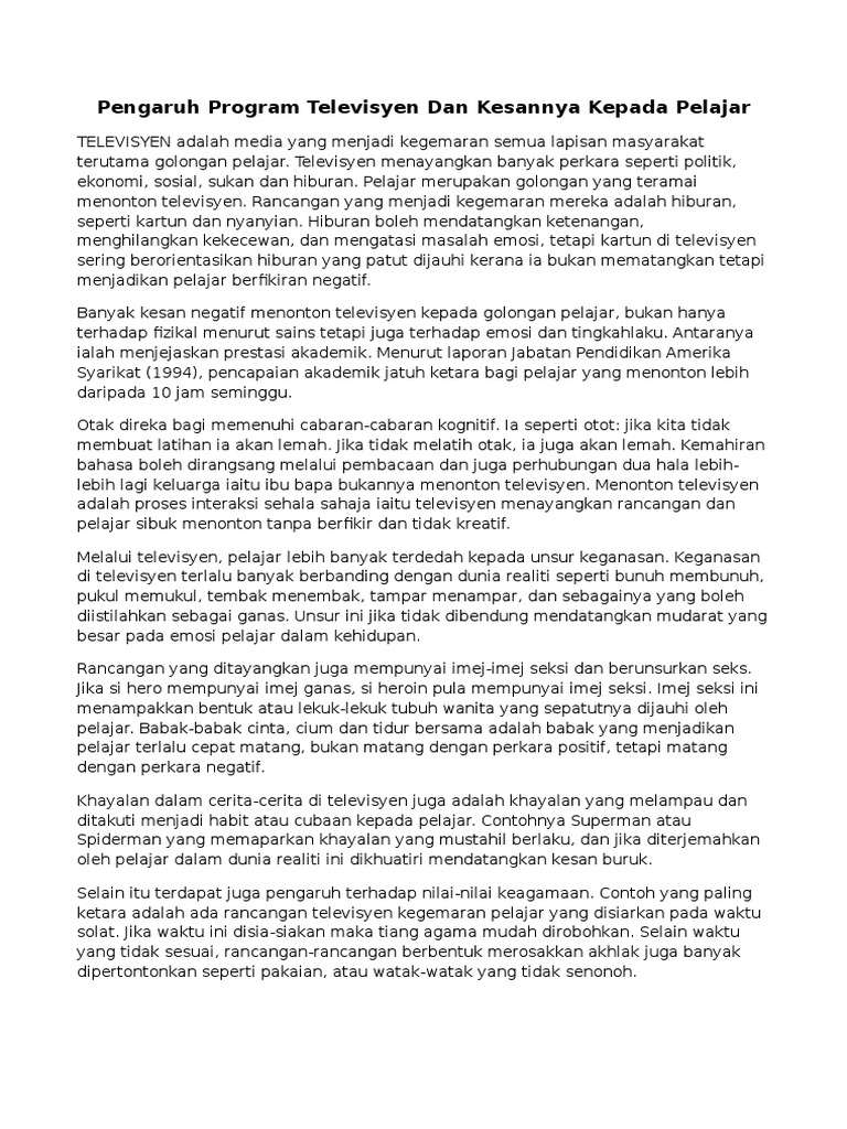 Live worksheets > malay > bahasa melayu (bm) > perkataan > kebaikan dan keburukan menonton televisyen. Paip poli paip pvc keburukan dan kebaikan paip pvc keburukan dan kebaikan paip polifull description. Anda boleh menguasai kepakaran pengendali filem dan televisyen di universiti atau, lulus kursus di studio atau televisyen stesen. Kemajuan ict telah menyumbang dalam meningkatkan pengurusan dan pentadbiran negara ke arah lebih. Namun pernahkah kita terfikir akan kebaikan dan keburukan tv ini kepada kita semua? Pelopor kebaikan atau kejahatan, yang mana kita? Hal ini demikian kerana, kita dapat lihat bahawa apa sahaja. Apabila anda menyiarkan iklan televisyen, anda sering mempunyai penonton yang tawanan. Boleh memudahkan kita berhubung dengan sesiapa saja walau dimana jua. Menyoroti ciri utama dan kekurangan televisyen digital, interaktif, dan satelit akan mengelakkan kos kewangan yang tidak perlu. Namun, penyiaran pelbagai rancangan berbentuk hiburan telah menyebabkan ada pihak beranggapan bahawa. Televisyen sering dianggap sebagai satu ciptaan moden yang banyak membawa kebaikan kepada manusia pada zaman moden ini. Purata amerika membelanjakan empat atau lebih jam sehari menonton televisyen, menurut syarikat nielsen.