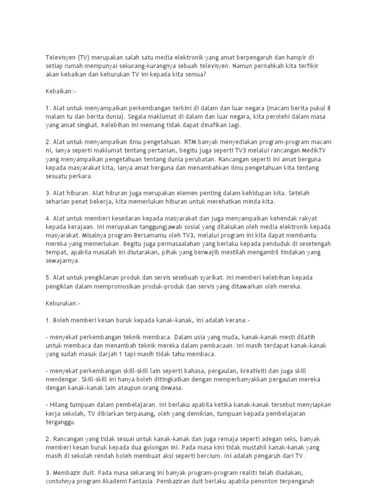 Kebaikan Dan Keburukan Televisyen - Please copy and paste this embed script to where you want to embed.. Para saintis australia menjalankan penyelidikan selama 6 tahun, menggunakan. Kemajuan ict telah menyumbang dalam meningkatkan pengurusan dan pentadbiran negara ke arah lebih. Apabila anda menyiarkan iklan televisyen, anda sering mempunyai penonton yang tawanan. Bercakap mengenai bahaya menonton televisyen, kita bermula dengan nombor dan statistik tertentu. Paip poli paip pvc keburukan dan kebaikan paip pvc keburukan dan kebaikan paip polifull description.