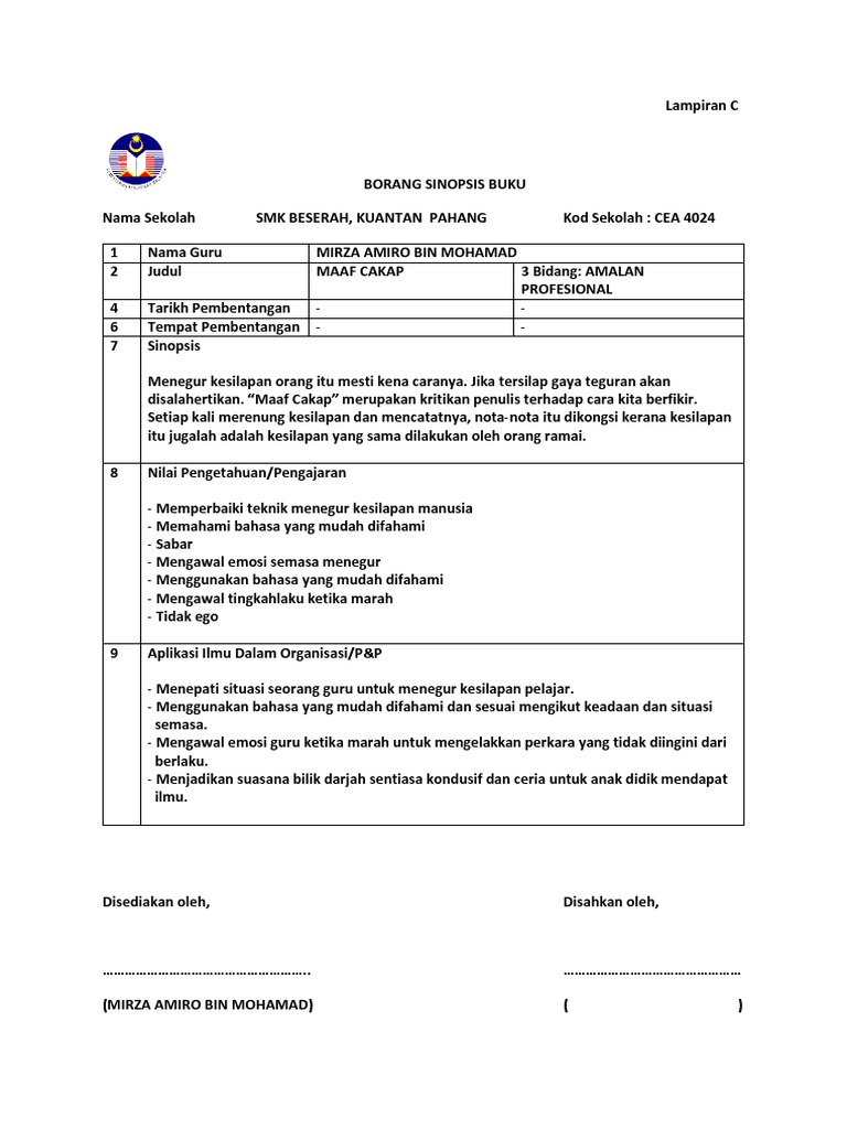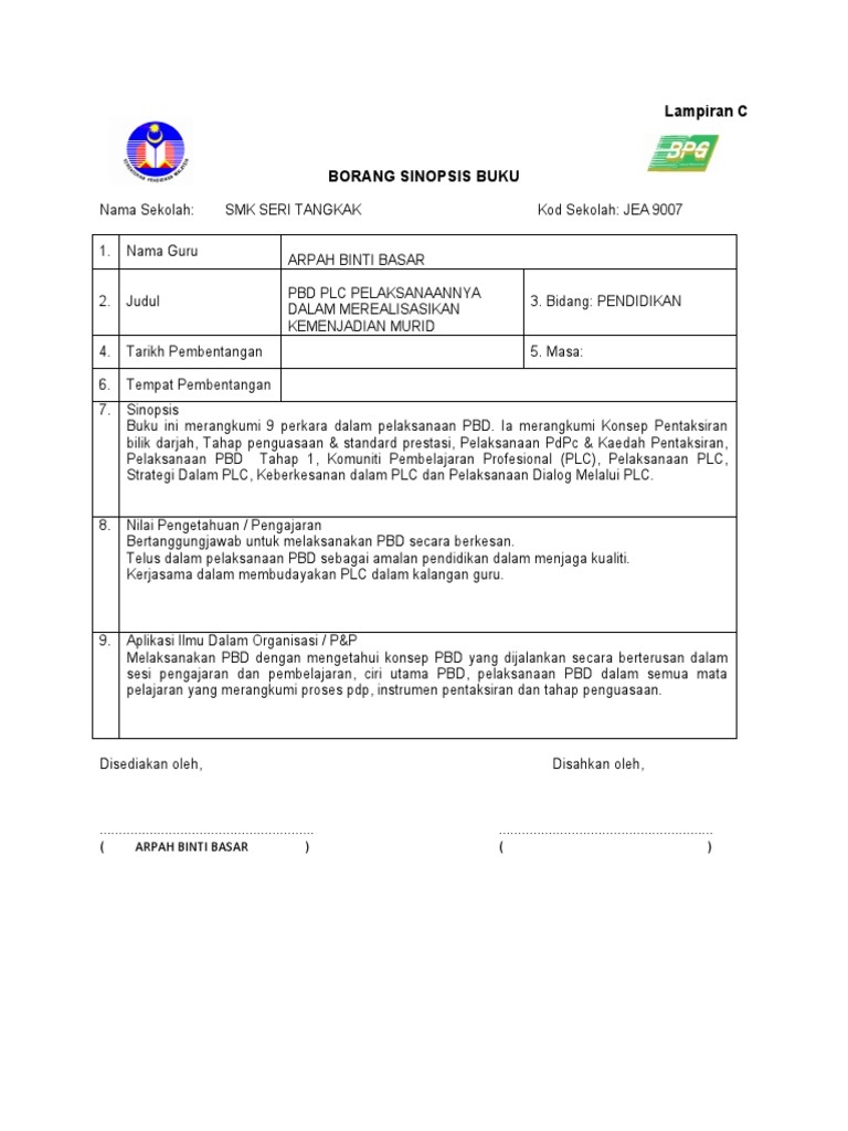 Borang sinopsis buku nama sekolah. Sinopsis fisik tentunya digunakan untuk membuat cerita singkat dari sebuah cerita fisik. Borang sinopsis kaedah pembacaan buku nama sekolah : Akan tetapi sinopsis tidak sebatas untuk adegan pementasan saja melainkan juga untuk seorang penulis. Borang sinopsis kaedah pembacaan buku nama sekolah : Lampiran c borang sinopsis buku nama sekolah: Sinopsis buku adalah ringkasan ringkas dari jalan cerita atau kandungan buku. Sinopsis dibagi menjadi tiga bagian. Untuk bisa menulis sinopsis buatu buku dengan baik, kamu harus membaca seluruh isi buku dengan cermat agar kamu bisa memahami dengan baik tebal buku : Adanya suatu ajakan ataupun motivasi bagi para pembaca, untuk membaca buku itu serta dikemas sebaik mungkin agar pembaca tertarik untuk membaca. We are a sharing community. Buku ini mengundang kita untuk meletakkan gadget sesekali dan menemukan kembali kesenangan sederhana menghabiskan waktu secara offline. Sinopsis buku ini disediakan khas untuk pelajar dengan memberi penekanan kepada dua aspek iaitu kemahiran membaca dan menulis.