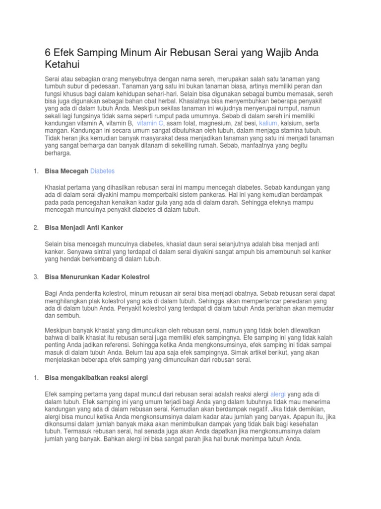 Khasiat Air Rebusan Serai Dan Bawang Putih : Manfaat air rebusan sereh, jaga kesehatan mulut hingga turunkan kolesterol sereh atau serai bukan sekadar bumbu masak.. Penelitian telah mengaitkan bahan aktif bawang putih dengan tekanan darah rendah, dan ekstrak bawang putih juga terbukti menurunkan kadar kolesterol. Hal tersebut di karenakan kandungan vitamin yang mengandung kolagen yang berfungsi untuk menjaga serta melindungi dan melembapkan kulit. Saat makan bawang putih atau memasukkannya ke dalam makanan, maka tetap bisa mendapatkan manfaatnya namun kurang efektif. Untuk menjaga tekanan darah tetap terkendali, anda bisa menyeduhnya menjadi teh. Bawang merah dan bawang putih mengandung senyawa sulfur bioaktif yang dipercaya memiliki efek pada setiap pembentukan kanker dan banyak proses biologis yang mengubah risiko kanker.