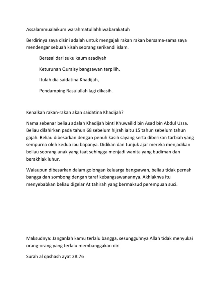 Nama penuhnya siti khadijah binti khuwailid bin asad bin abdul uzza bin qushai. Siti khadijah memberikan seluruh yang dia punya untuk kejayaan islam. Khadijah sebelumnya sudah menikah 2 kali sebelum menikah dengan nabi saw. Untuk anak sulungnya, penyanyi itu mengungkapkan rasa kasih dan. Kecantikannya pun diakui seantero penduduk mekkah.